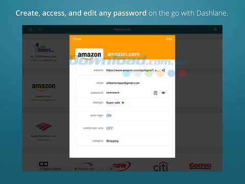 Dashlane giúp bạn dễ dàng quản lý mật khẩu và thông tin cá nhân được sử dụng trên trang web. Với Dashlane, người dùng sẽ giảm bớt công đoạn nhập liệu thủ công trên bàn phím nhỏ của iPhone, cho phép đăng nhập tự động và điền mẫu nhanh chóng. Dashlane cũng hỗ trợ tạo mật khẩu mạnh mẽ. Truy cập dữ liệu tại nhà, tại công sở hay bất cứ đâu mà bạn muốn.