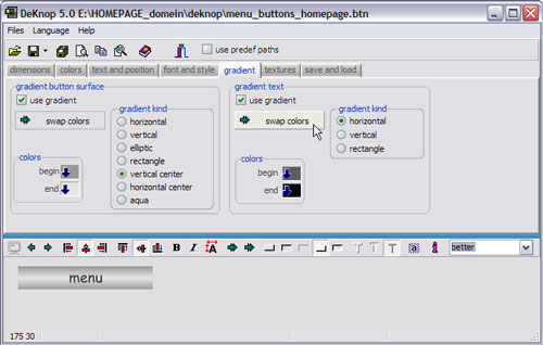 DeKnop 5.0 là chương trình miễn phí dùng để thiết kế các nút bấm (button) cho trang web một cách chuyên nghiệp. Bạn không cần phải sử dụng thành thạo các chương trình đồ họa, bởi chương trình cung cấp các mẫu thiết kế sẵn, bạn chỉ việc chọn font, màu sắc, hình dạng, kích thước và đánh một vài chữ thể hiện trên nút bấm là xong... Trong quá trình thiết kế, bạn có thể xem trước các nút bấm để chọn một cái ưng ý nhất. Chương trình hỗ trợ lưu những mẫu thiết kế dưới dạng ảnh *.PNG, *.JPG, *.BMP, *.GIF.