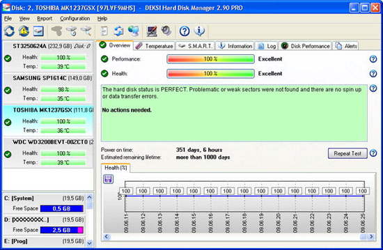 DEKSI Hard Disk Manager là một ứng dụng phân tích và kiểm tra ổ cứng. Mục đích của nó là tìm, test, chuẩn đoán và khắc phục các vấn đề lỗi ổ cứng, báo cáo và hiển thị trạng thái sức khỏe của HDD/SSD, cũng như sự giảm sút về hiệu suất và các lỗi. DEKSI Hard Disk Manager sẽ cung cấp các mô tả chi tiết bằng văn bản, các mẹo và hiển thị hay báo cáo thông tin toàn diện nhất về ổ cứng và SSD bên trong máy tính hoặc các ổ cắm ngoài (USB / e-SATA). Nhiều cảnh báo và các tùy chọn báo cáo khác nhau được cung cấp để bảo đảm tối đa sự an toàn cho dữ liệu có giá trị của bạn. Phần mềm có thể kiểm tra trạng thái HDD, gồm có trạng thái, nhiệt độ và tất cả các giá trị S.M.A.R.T. (Self-Monitoring, Analysis and Reporting Technology, đi kèm với hầu hết các ổ cứng và các SSD ngày nay). Nó cũng có thể đo được tốc độ trao đổi dữ liệu của đĩa theo thời gian thực, một thông số có thể được sử dụng làm tiêu chuẩn hoặc để phát hiện các lỗi ổ cứng hay sự sụt giảm về hiệu suất có thể.