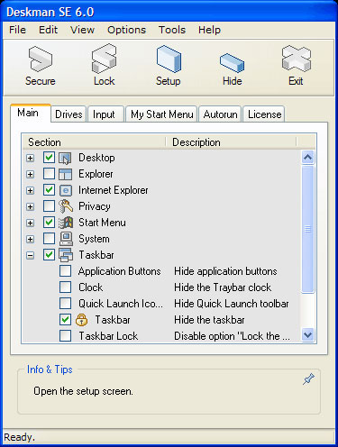 Deskman SE cho phép bạn bảo vệ máy tính rất nhanh chóng. Kết hợp các lựa chọn khác nhau, bạn có thể dễ dàng có được mức độ bảo mật theo mong muốn. Phần mềm này rất dễ sử dụng, cũng như đủ mạnh để đáp ứng nhu cầu cảu bạn. Giờ đây, với phần mềm này, bạn đã có thể rời máy tính mà không phải lo ngại gì cả. Chỉ có bạn mới có thể mở khóa màn hình và tiếp tục các tác vụ đang bỏ dở. Khóa màn hình còn tiện ích trong việc bảo vệ màn hình máy tính với mật khẩu, giúp đảm bảo rằng chỉ những người có mật khẩu mới có thể sử dụng máy tính. Các tính năng mới bao gồm khả năng loại bỏ tổ hợp phím Ctrl - Alt - Del, và các tổ hợp phím kết hợp khác; khả năng tạo riêng của bạn một menu Start, cùng với các tính năng khác. Thêm vào đó, chế độ Kiosk mới cung cấp cho bạn những khả năng bảo vệ màn hình desktop khác. Cho dù bạn cần bảo vệ trạm làm việc hoặc khóa màn hình máy tính, Deskman SE là công cụ của bạn.