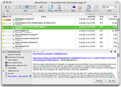 DEVONthink là giải pháp cho thời kỳ công nghệ số, một cơ sở dữ liệu cho tất cả dữ liệu của bạn. Chương trình này rất linh hoạt. Chương trình này có thể đáp ứng các nhu cầu cá nhân của bạn. Sử dụng nó giống như nơi chứa dữ liệu của bạn, lưu trữ email hoặc sắp xếp các dự án. Thu thập và sắp xếp dữ liệu từ web, nâng cấp nó với âm thanh và các file phim, trích xuất tất cả mọi thứ như một trang web, kéo chúng vào dữ liệu để in hoặc copy chúng vào iPod.