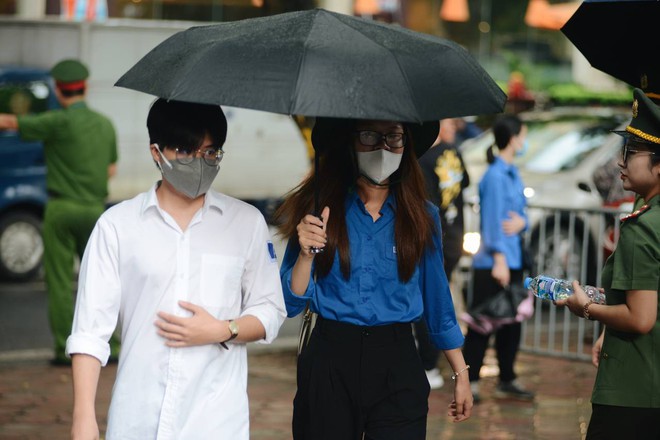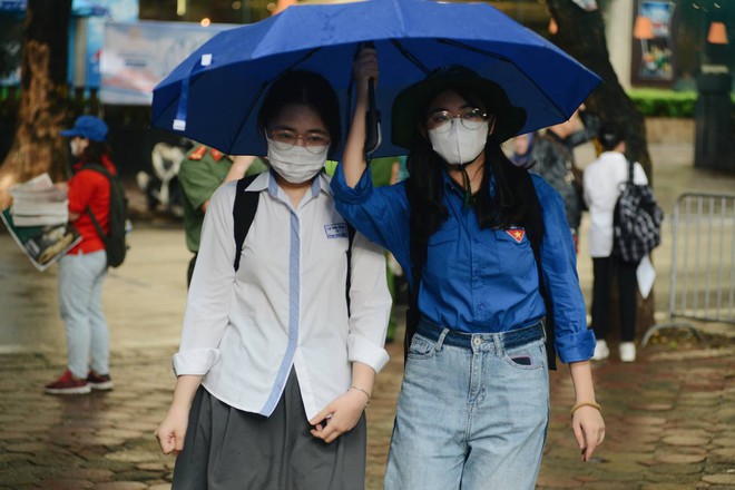 Tại điểm trường THPT Phan Đình Phùng, thời tiết mưa nên các TNV tranh thủ ra che ô cho các bạn thí sinh