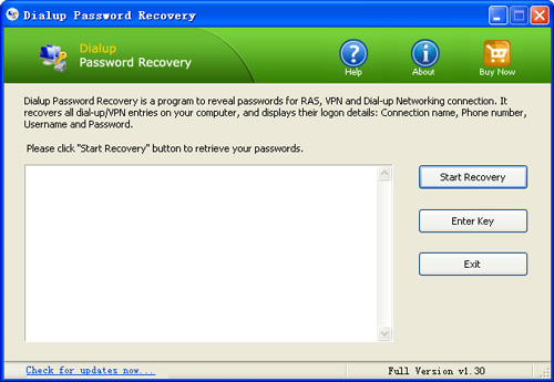 Giải pháp: Dialup Password Recovery cung cấp cho bạn một giải pháp đơn giản để giải quyết vấn đề này. Phần mềm này sẽ hiển thị (khôi phục) mật khẩu và đăng nhập cho truy cập mạng LAN, Internet (bao gồm kết nối modem, đường ISDN, mạng ảo cá nhân) và làm việc với Windows 7, Vista, 2008, XP, 2003, NT, 2000, 98.