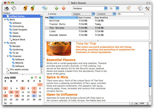 Dossier là một công cụ quản lý thông tin đầy đủ các chức năng dành cho Mac. Đây là công cụ lý tưởng dành cho việc giữ và sắp xếp các note, danh sách cần làm, mật khẩu,… Dossier tập trung vào giao diện dễ sử dụng, với trình hiển thị đa tài liệu và hiển thị đồng thời từng tài liệu, folder thông minh, tìm kiếm trực tiếp, hỗ trợ blog, lịch đã được tiếp hợp, giải mã, khả năng in các entry, folder hoặc toàn bộ dữ liệu, chỉnh sửa văn bản, hỗ trợ xuất,…