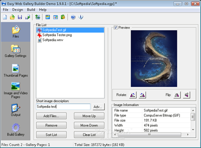 Easy Web Gallery Builder hỗ trợ tất cả các định dạng ảnh phổ biến hiện nay, sử dụng các thuật toán nhằm thay đổi kích cỡ ảnh và tạo file thumb. Người sử dụng có thể save và load lại mỗi project đang làm dở, có thể sử dụng phần mềm này để tạo file thumbnails, thay đổi kích cỡ file ảnh, hoặc chuyển đổi định dạng giữa các file ảnh.
