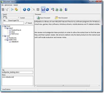 EDocAdmin là một ứng dụng có thể giúp người dùng lưu trữ và quản lý tài liệu của họ. Hệ thống lưu trữ nội bộ cho phép bạn lưu trữ các tài liệu điện tử khác nhau trong một hoặc một vài cơ sở dữ liệu tài liệu. Chương trình có thể mã hóa các tập tin của bạn và bạn có thể thiết lập quyền truy cập cho mỗi tập tin. Cơ sở dữ liệu có thể được lưu trữ tại đĩa cục bộ hoặc ổ đĩa mạng và nhiều người dùng có thể làm việc với một cơ sở dữ liệu cùng một lúc. Bạn cũng có thể xuất hoặc nhập vào toàn bộ thư mục trên máy tính, tìm kiếm các tập tin theo tên tập tin hoặc nội dung. Ngoài ra, EDocAdmin còn cung cấp khả năng sao lưu cho phép bạn tạo ra các bản sao lưu dự phòng.