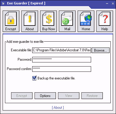 Từ giao diện làm việc chính của chương trình, nhập đường dẫn files chạy cần được khóa vào tại tùy mục Executable, nhập mật khẩu để khóa files vào tại tùy mục Password. Bấm vào Backup the executable file nếu muốn tạo thêm một bản dự phòng ở file bị khóa. Ngoài ra, bạn có thể bấm vào tùy chọn Options để tinh chỉnh thêm một số tính năng nổi bật của chương trình mà ở các chương trình khóa files (*.exe) không hề có như: