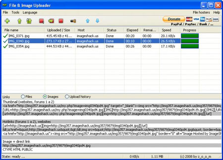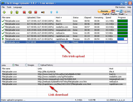 Tiến trình upload được tiến hành lần lượt với từng trang web, thông tin về quá trình upload được hiển thị ở phần trên của chương trình, liên kết download được hiển thị ở cửa sổ bên dưới. Bạn có thể sử dụng ngay các link này để chia sẻ với bạn bè.