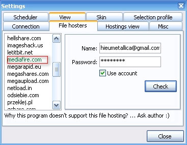 - Filehoster: Sử dụng các tài khoản đã đăng ký tại các file hosting, bạn hãy điền đầy đủ thông tin và tích vào trước ô: “Use account”. Nếu account nào vẫn đang hoạt động, nó sẽ có màu xanh.