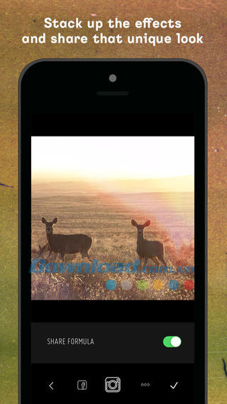 Sau khi hoàn tất việc chỉnh sửa bằng cách sử dụng một hiệu ứng độc lập hay kết hợp nhiều bộ lọc lại với nhau, người dùng có thể kết thúc khâu chỉnh sửa và chia sẻ ảnh tức thời. Chọn tùy chọn Share Formula hoặc tất chức năng này. Chia sẻ ảnh trên mạng xã hội Facebook, Instagram, Twitter hoặc gửi qua thư điện tử dưới dạng tệp tin đính kèm.
