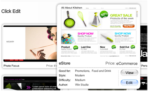 Wix.com là một công cụ hỗ trợ trực tuyến giúp bạn thiết kế Website theo một phong cách riêng, vừa bắt mắt, vừa đạt hiệu quả tốc độ load. Đây thực sự là một phần mềm trực tuyến thiết kế flash rất hữu ích cho những ai không có kiến thức về thiết kế flash. Công việc của bạn thật đơn giản, hãy đăng ký một tài khoản tại website. Sau đó đăng nhập vào tài khoản. Trên giao diện của Wix.com sẽ xuất hiện danh mục của các mẫu website đã được sắp xếp sẵn theo chủ đề. Giờ đây bạn có thể tạo ra một website flash trong vài phút với một phong cách thiết kế hoàn toàn khác lạ và đẹp mắt.