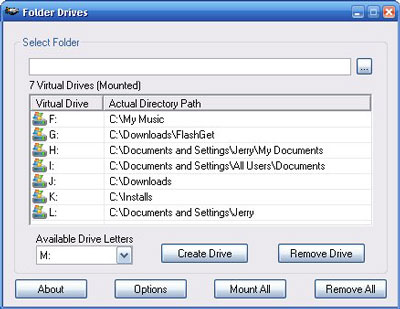 Sau khi tải về, cài đặt rồi kích hoạt chương trình, bạn nhắp nút... hay gõ đường dẫn của thư mục muốn truy xuất nhanh vào ô Select Folder. Kế tiếp, bạn chọn các ký tự đại diện sẵn có cho ổ đĩa ảo ở hộp Available Drive Letters rồi nhắp nút Create Drive để tạo ổ đĩa. Khi muốn gỡ bỏ, bạn chọn ổ đĩa trong danh sách rồi nhắp Remove Drive. Nút Mount All cho phép ánh xạ tất cả ổ đĩa trong danh sách, nút Remove All gỡ bỏ tất cả. Nút Options đưa ra 4 chọn lựa khởi động cùng Windows: Run Folder Drives in the System Tray but don’t mount Virtual Drives (chạy chương trình ở khay hệ thống nhưng không ánh xạ ổ đĩa), Mount Virtual Drives and then close Folder Drives (ánh xạ ổ đĩa rồi đóng chương trình), Run Folder Drives in the System Tray and Mount Virtual Drives (chạy chương trình ở khay hệ thống và ánh xạ ổ đĩa) và Don’t run Folder Drives or Mount Virtual Drives (không chạy chương trình cũng không ánh xạ ổ đĩa).