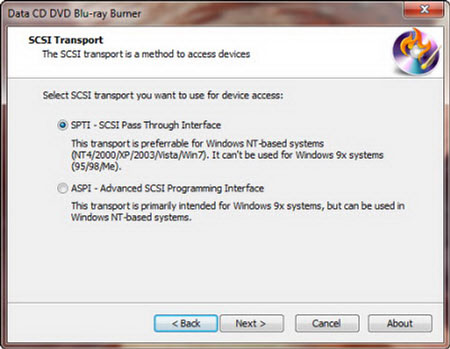 Sau khi đã chọn được phương thức ghi đĩa thì bạn nhấn Next trên cửa sổ hiện ra của thuật sĩ (wizard) ghi đĩa. Tiếp theo, bạn chọn SPTI – SCSI Pass Through Interface (nếu dùng hệ điều hành Windows 2000/XP, Vista, 7) hoặc chọn ASPI – Advanced SCSI Programming Interface (nếu sử dụng các hệ điều hành cũ hơn như Windows 9x) > nhấn Next.