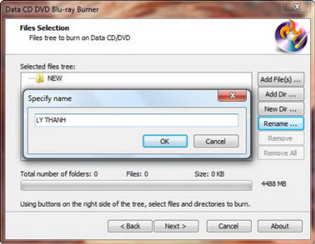Để thêm dữ liệu tập tin vào thì chọn Add File(s)… hoặc thêm dữ liệu vào từ một thư mục thì chọn Add Dir..., New Dir… (tạo thư mục mới). Mặc định, tên đĩa sẽ được đặt là NEW, để thay đổi thì bạn chọn vào thư mục NEW, rồi nhấn Rename để sửa đổi.