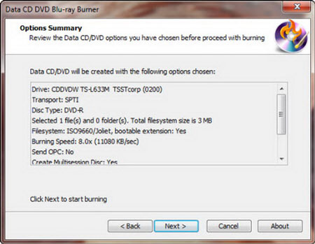 Tương tự, khi ghi Audio CD hay ghi dữ liệu từ tập tin ISO thì bạn cũng cần phải thiết lập tốc độ ghi đĩa và vài thiết lập khác (để đơn giản, bạn có thể bỏ qua bằng cách nhấn Next mặc định).