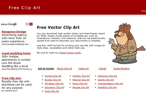 Free Vector Clip Art là website cung cấp miễn phí hàng ngàn hình clip-art được phân loại theo chủ đề. Bạn có thể tải miễn phí về sử dụng làm hình ảnh minh họa cho các tài liệu Word, Excel... hay đưa vào trang web. Website được phân loại với hơn 10 chủ đề chính, mỗi chủ đề chính lại có thêm vài chủ đề phụ nên rất dễ tìm kiếm. Đây là một trang web cho phép tải về toàn bộ hình ảnh clip-art mà không đòi hỏi phải đăng ký và cũng không bị ép xem quảng cáo.
