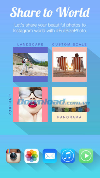 Full Size Photo Free for iOS là ứng dụng được thiết kế bởi những người dùng yêu thích dịch vụ chia sẻ ảnh Instagram, cho phép đăng ảnh kích cỡ đầy đủ mà không cần cắt ảnh vuông.