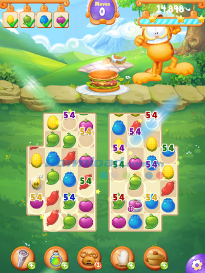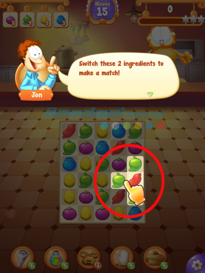 Hãy tham gia cùng với Jon, Garfield và nhiều người bạn dễ thương khác trong chuyến chu du vòng quanh thế giới để học hỏi công thức nấu ăn đặc biệt của vua đầu bếp! Nhiệm vụ của bạn chỉ đơn giản là ghép các loại thực phẩm giống nhau và sắp xếp chúng theo hàng ngang hoặc dọc từ 3 đơn vị trở lên để phá vỡ chúng khỏi màn hình và thêm vào món ăn mới. Cố gắng tạo ra các combo của 4, 5 đơn vị... và sử dụng các thành phần đặc biệt này để hoàn thành món ăn nhanh hơn!