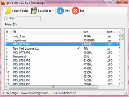 Từ giao diện chính, bạn bấm nút Select Folder để chọn chọn thư mục mà bạn cần tìm kiếm. Ngay sau khi chọn xong thư mục công cụ này sẽ tự động liệt kê ra tất cả các tập tin, các định dạng cùng với với dung lượng, thời gian sửa đổi … Bạn cũng có thể lọc ra các tập tin từ danh sách. Ngoài ra còn có một tùy chọn để lưu trong danh sách các tập tin thành định dạng txt, HTML, CSV và XML bằng cách bạn bấm nút Save list as để chọn.