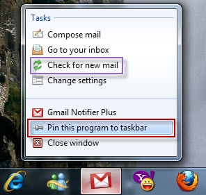 Ngay lâp tức, cửa sổ của chương trình Gmail Notifier sẽ được ẩn đi, nhưng một biểu tượng của nó vẫn hiển thị dưới thanh taskbar. Để ứng dụng khởi động cùng máy và có thể kiểm tra thư nhanh chóng, nhấn chuột phải vào biểu tượng lá thư của chương trình, chọn Pin this program to taskbar.