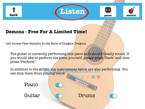 - Chơi bản nhạc bất kỳ cùng ban nhạc. Đây là tính năng khá độc đáo mà nhiều ứng dụng chơi ghita khác không có.