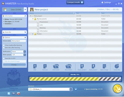 Phần mềm ghi đĩa miễn phí Burning Studio của Hamster thực hiện các hoạt động phổ biến nhất với đĩa laze: ghi dữ liệu, sao chép sao lưu, tạo đĩa nhạc, sao chép DVD, CD hoặc BluRay.