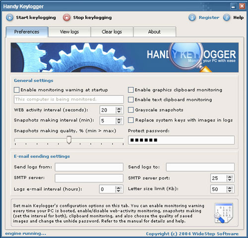 Handy Keylogger 4.0 là phiên bản mới của phần mềm keylogger đã được nhận giải thưởng, giúp bạn có toàn quyền kiểm soát máy tính, và hoàn toàn không bị phát hiện bởi người khác. Với phần mềm này, bạn có thể bắt đầu giám sát ẩn chỉ với một vài lần kích sau khi hoàn thành donwload. Handy keylogger thực hiện công việc rất tốt với 4 chế độ ghi: bản ghi nhấn phím, bản ghi clipboard, bản chụp màn hình và các trang đã truy cập.
