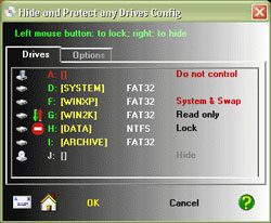 Giao diện mặc nhiên ứng với nút Drives sẽ liệt kê tất cả các ổ đĩa hiện có trên máy tính (kể cả đĩa flash). Để khóa ổ đĩa nào bạn chỉ cần nhắp chuột vào ổ đĩa đó (trừ ổ đĩa C), ổ đĩa được khóa sẽ xuất hiện nút tròn đỏ có dấu gạch trắng phía trước.