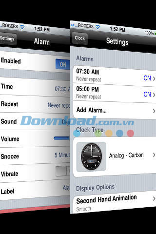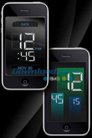 Ứng dụng bao gồm mặt động hồ chuẩn dạng Carbon Analog và đồng hồ kỹ thuật số Green. Bên cạnh đó là các loại mặt dạng bong bóng, khá đặc biệt và thời trang, hay mặt kỹ thuật số Carbon kết hợp với kiểu thiết kế Analog truyền thống tạo ra sự khác biệt cho ứng dụng đồng hồ báo thức.