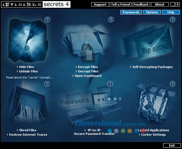 Invisible Secret 4 cung cấp nhiều khả năng như ẩn thư mục, mã hóa file, xóa file ở mức độ không thể phục hồi được, xóa toàn bộ mọi dấu vết của những ứng dụng đã truy cập, bảo mật qua IP, khóa mọi ứng dụng và thiết lập…