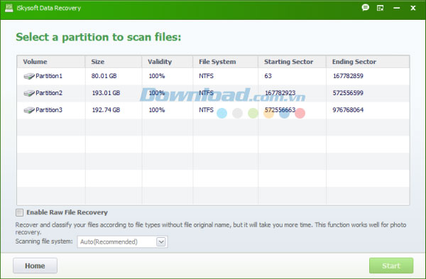 Sau đó, phân cùng bị mất hoặc xóa sẽ được hiển thị trong cửa sổ. Kiểm tra phân vùng mà mình cần phục hồi và nhấn “Start” để quét tập tin trên đó.
