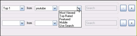 Khung tiếp theo là mục tải, bạn có thể tải, chẳng hạn với Youtube, bạn có thể tải file theo dạng được xem nhiều nhất Most Viewed, được bình chọn nhiều nhất Top Rated,...Nếu muốn thêm các tác vụ tải từ những địa chỉ khác, bạn nhấn nút + rồi làm tương tự.