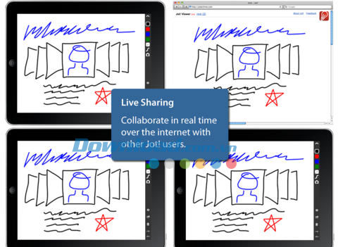 Xem toàn bộ bản vẽ của người dùng Jot! Whiteboard Free khác trong thời gian thực thông qua kết nối Internet. Tham gia Live Sharing để truy cập cùng trang trong một bản vẽ.
