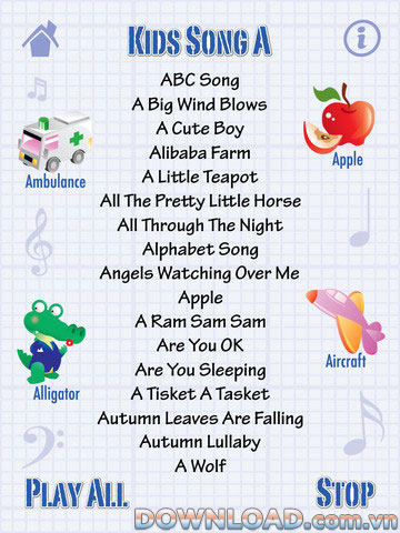 Kids Song A for iPad là bộ sưu tập các bài hát thiếu nhi tiếng Anh hấp dẫn trên giao diện HD tuyệt đẹp.