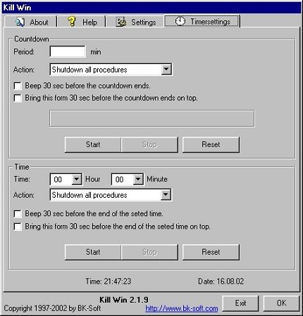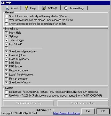 Kill Win 2.2 sẽ cho phép bạn tắt hệ thống máy tính của mình chỉ bằng một động tác click đơn giản trên màn hình desktop. Ngoài ra, chương trình cũng sẽ giúp bạn khởi động lại và tắt máy.