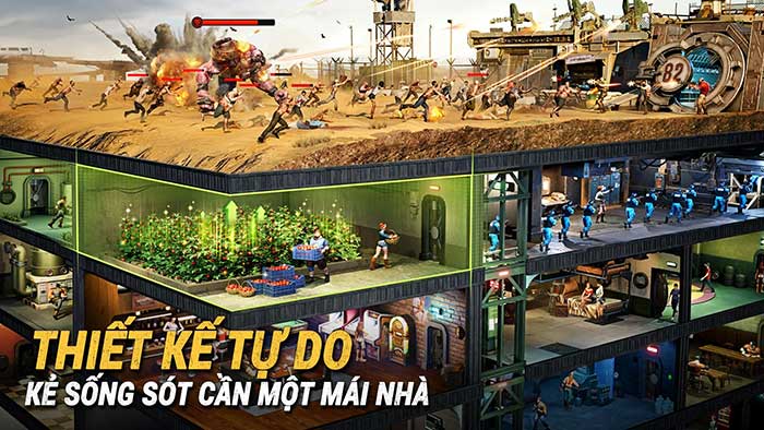 Người chơi được tự do thiết kế và xây dựng căn cứ, các tòa nhà, thiết lập và điều chỉnh bố cục khu vực. Nâng cấp các tòa nhà để cải thiện hiệu quả sản xuất, từ đó tăng thêm người sống sót làm việc cho căn cứ, củng cố cơ sở để sống sót.
