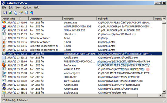 - Sau khi bạn chạy LastActivityView, nó quét máy tính của bạn và hiển thị tất cả các hành động và các sự kiện được tìm thấy trên hệ thống.