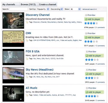 Cửa sổ trình duyệt web sẽ đưa bạn đến trang chủ của chương trình. Tại đây, bạn có thể thêm hoặc bớt các kênh yêu thích. Mặc định các kênh đã được sắp xếp theo bình chọn của người sử dụng trên khắp thế giới, dựa vào đó, bạn có thể dễ dàng lựa chọn được những kênh yêu thích cho mình. Để thêm 1 kênh yêu thích vào danh sách của chương trình, bạn chỉ việc click vào nút Add to Player ở cạnh kênh đó. Bây giờ, trong danh sách các kênh đang phát sẽ bao gồm kênh mà bạn vừa chọn lựa.