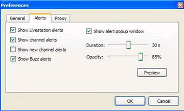 - Ngoài ra, chúng ta cũng có thể thiết lập để chương trình thông báo cho bạn biết những diễn biến mới từ các kênh đã chọn. Chẳng hạn như là những tin tức mới, những update mới của LiveStation và các chương trình mới… Để thiết lập thời gian định kỳ để thông báo, tại cửa sổ Prefrences, bạn click vào tab Alert và thiết lập thời gian bằng thanh trượt ở mục Durtions. Mặc định của thời gian này là 30 giây.
