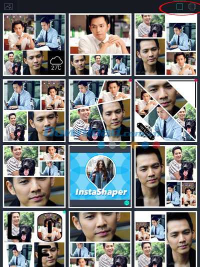 Tiếp theo, những bức ảnh này sẽ được ghép tự động vào các bố cục (layout) có sẵn, theo dạng ảnh vuông để chia sẻ trọn vẹn trên Instagram hoặc ảnh dọc. Toàn bộ bố cục ghép ảnh sẽ xuất hiện trên một màn hình, bạn có thể chọn ảnh ghép bất kỳ để chuyển qua bước chỉnh sửa ảnh.