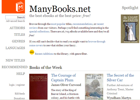 Cung cấp hơn 26.598 ebook miễn phí các loại. Bạn có thể tìm ebook theo: tên tác giả, nhan đề, thể loại hay ngôn ngữ viết sách, rất tiếc là chưa có Tiếng Việt. Khi tìm thấy ebook mà mình thích bạn có thể xem trực tuyến ( bấm vào liên kết read online) hoặc tải xuống (chọn định dạng cần tải rồi bấm vào nút download). Manybooks hỗ trợ nhiều định dạng cho bạn tải như: pdf,txt,...