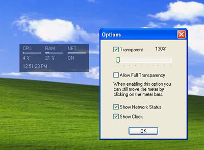 Micro Meter sẽ cho người dùng thấy tình trạng mạng, CPU, RAM. Bạn có thể thiết lập các tùy chọn bằng cách nhấp vào biểu tượng ở khay hệ thống và chọn Options hoặc chuột phải lên chính nó.