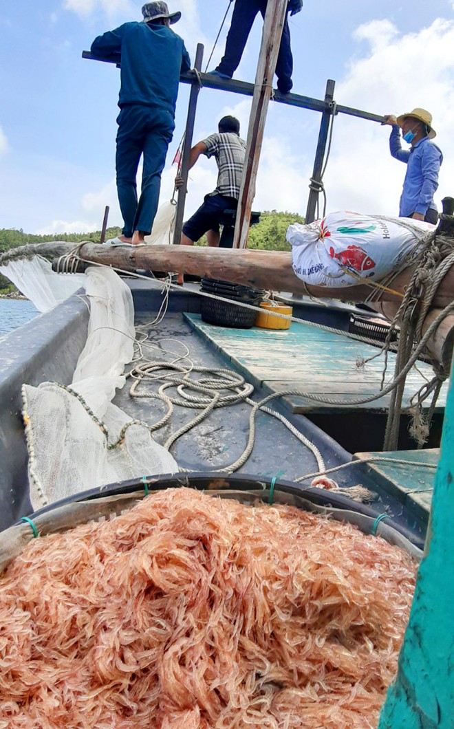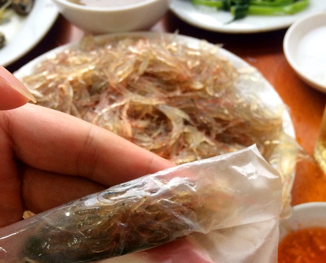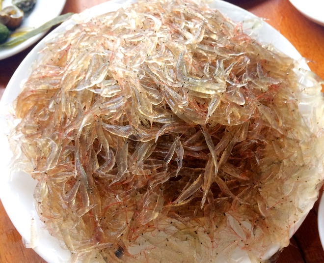 "Tép biển tươi đúng mùa ăn gỏi là ngon nhất" - anh bạn hướng dẫn viên bản địa ngỏ ý mời chúng tôi thưởng thức gỏi tép. Quả thật, chúng tôi may mắn khi gặp đúng ngày đánh được mẻ tép to. Từng rổ tép được vớt lên, tép vẫn còn tươi sống, trong vắt. Thú vị là chúng tôi có duyên thưởng thức món ăn được chế biến theo đúng phong cách ngư dân.