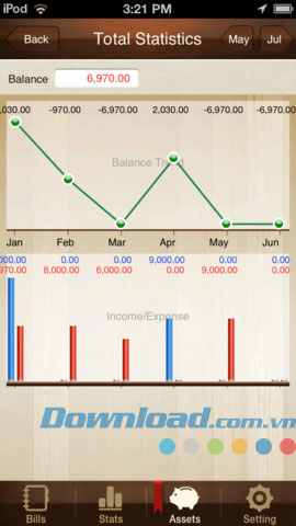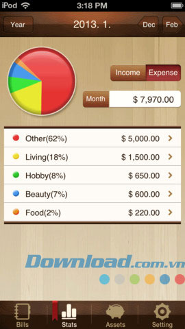 Dựa vào dữ liệu được nhập vào, người dùng có thể xem tức thời chi phí sử dụng thông qua các danh mục cũng như thay đổi theo từng tháng. Ngoài ra, bạn có thể theo dõi sự thay đổi của phần tài sản cá nhân và tỷ lệ thu nhập hoặc chi phí được minh họa bằng biểu đồ.