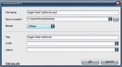 Một hộp thoại hiện ra cho phép điền tên file nhạc download được cũng như chọn vị trí để lưu file. Bạn cũng có thể chọn để thay đổi tần số file nhạc (bitrate). Tuy nhiên với bản miễn phí, bitrate chỉ tối đa ở mức 128kps (chất lượng cao). Nhấn vào mục Show tag edit để thêm thông tin cho file MP3 (nếu muốn).
