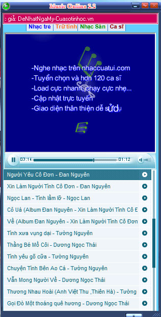 - Chức năng chơi nhạc tại web nhaccuatui.com, với playlist tổng hợp và danh sách 76 ca sĩ riêng biệt, mặc định tất cả playlist này được cập nhật tự động từ tác giả và người dùng có thể tự thay đổi thành playlist riêng của mình bằng cách thay đổi trong các file html.