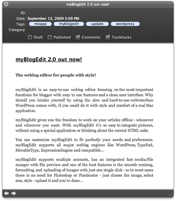 Tại sao người sử dụng vẫn phải chịu đựng những "ấm ức" khi sử dụng một hệ thống khá rối rắm, phức tạp cùng với giao diện không mấy đơn giản như của WordPress, tất cả sẽ được giải quyết ổn thỏa với myBlogEdit, người sử dụng có thể tạo được phong cách cho riêng mình dựa trên hệ điều hành MAC.