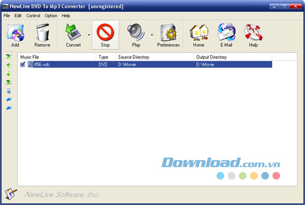 NewLive DVD To MP3 Converter:Đây là công cụ chuyên dùng để trích xuất âm thanh từ đĩa DVD thành MP3. Cách sử dụng cũng rất dễ dàng: Nhấn vào nút “Add” Nhấn vào nút “Add” -> tìm đến và nhấp đúp vào biểu tượng của ổ đĩa DVD -> vào thư mục chứa file video của đĩa DVD là VIDEO_TS và dùng tổ hợp phím Ctrl+A để chọn toàn bộ các file video có đuôi VOB ở đây -> click “Open” để các file này hiện ra trong danh sách liệt kê -> nhấn vào nút “Convert” và chọn 1 trong 3 định dạng file xuất là MP3, WMA hoặc WAV, quá trình trích xuất âm thanh sẽ diễn ra ngay sau khi chọn.