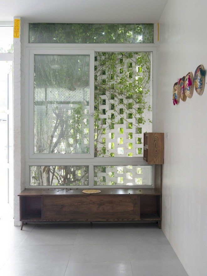 Khoảng trống ở góc thon nhất phía trước khu đất, được sử dụng để trồng cây xanh tạo sự riêng tư cho không gian bên trong, ngăn cách với đường đi nhưng vẫn đảm bảo thông gió và ánh sáng tốt cho phòng khách và mặt tiền.