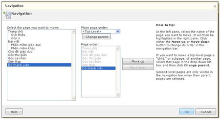 Khi đã tạo đầy đủ các trang, bạn cần sắp xếp và phân loại chúng lại thành menu chính hoặc menu thả xuống tương ứng. Vào thẻ Page Eidtor > chọn mục Advanced > chọn Change page navigation order, bạn chọn tên menu (tên trang) ở khung Select the page you want to move: nếu tạo ra trang thứ cấp (menu thả xuống) nằm sau trang chính (menu chính) thì nhấn chọn tên trang chính ở ô Place page under ; nếu muốn di chuyển thứ tự các trang (kể cả trang chính và trang thứ cấp) thì nhấn Move down (hoặc Move up), nhấn OK.